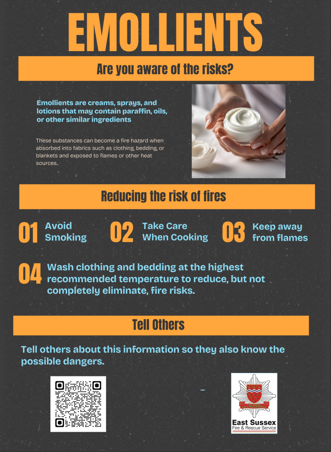 Tell others about this information so they also know the possible dangers. Emollient cream is now part of the Home Safety Visit report. Staff are guided to inform clients properly if they find that these creams are being used.